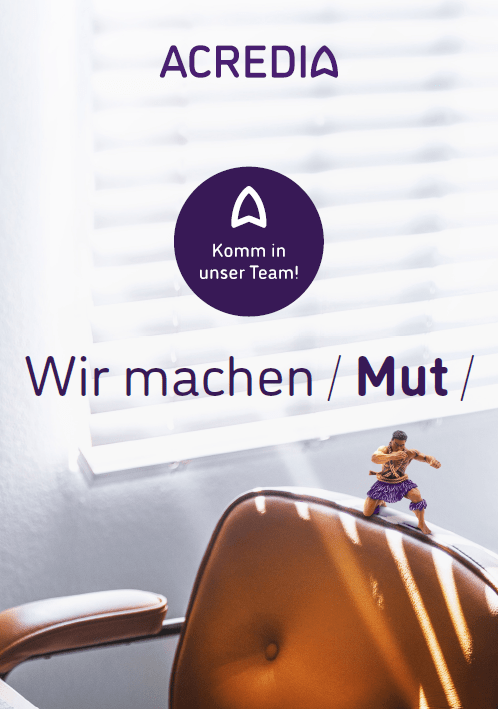Bei ACREDIA erwartet dich ein modernes und dynamisches Arbeitsumfeld, das von gegenseitigem Respekt, partnerschaftlichem Miteinander und transparenter Kommunikation geprägt ist. Wir ermutigen dich, neue Ideen einzubringen und Innovationen voranzutreiben.